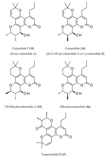 Two analogs of calanolide A (1), i.e., costatolide (14) and dihydrocostatolide (16), were shown to possess anti-HIV property similar to that of calanolide A (1) [26] and could be ascribed to the class of NNRTIs. In fresh human cells, costatolide (14) and dihydrocostatolide (16) could significantly inhibit the low-passage clinical virus strains, including those representative of the various HIV-1 clade strains, syncytium-inducing and non-syncytium-inducing isolates, and T-tropic and monocyte-tropic isolates [26,37]. In continuation of the search for new natural anti-HIV compounds, McKee et al. [20] purified calanolide E2 (12), and calanolide F (13) from extracts of C. lanigerum var. austrocoriaceum and C. teysmanii var. inophylloide (King.) P. F. Stevens, and calanolide E2 (12) emerged as one of the most active anti-HIV compounds. Later, costatolide (14) was reported as an anti-HIV compounds present in C. cerasiferum Vesque and C. inophyllum L. [24], while calanolides A (1), and C (6), and costatolide (14), isolated from the leaves of C. brasiliense, were shown to possess anti-HIV potential [4]. Comparative anti-HIV activities of some naturally occurring calanolides, e.g., calanolide A (1), costatolide (14) and dihydrocostatolide (16), against various strains of HIV are available in the article by Buckheit, et al. [26].
