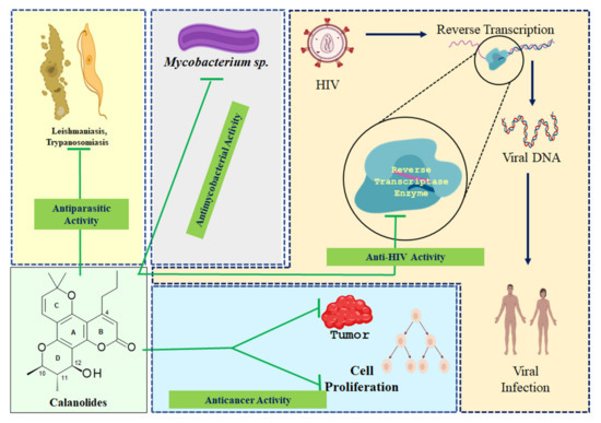 Although well-known for non-nucleoside reverse transcriptase inhibitory activity offering anti-HIV potential, calanolides have also been shown to possess various other pharmacological properties (Figure 3). The following sub-sections deal with anticancer, anti-HIV, antimycobacterial and antiparasitic activity of naturally occurring calanolides. As much of the published pharmacological studies, both in vitro and in vivo including human trials, on naturally occurring calanolides are about their anti-HIV property, over the years, significant amounts of information have become available on their mechanism of action, structure-activity-relationships, synergistic and/or additive property and their potential in anti-HIV combination therapy, which have been discussed adequately under individual headings within the anti-HIV sub-section. All other pharmacological properties of these compounds as outlined in different publications still require further investigations to establish their realistic therapeutic potential. Also, in silico pharmacological activity and toxicity studies on these pyranocoumarins have just begun to emerge in recent years.