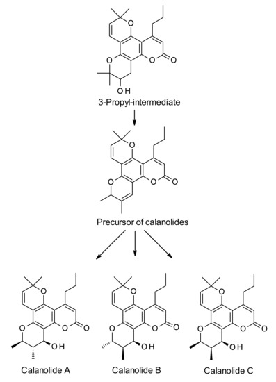 Calanolides are biosynthesized from the parent simple coumarin 7-hydroxycoumarin, also known as umbelliferone (Scheme 1, Scheme 2 and Scheme 3). The biosynthesis of umbelliferone in plants starts from the amino acid L-phenylalanine, and proceeds through the formation of trans-cinnamic acid, p-coumaric acid, 2-hydroxy-p-coumaric acid, 2-glucosyloxy-p-coumaric acid, and 2-glucosyloxy-p-cis-coumaric acid with the help of various enzymes like cinnamate 4-hydroxylase, 4-coumarate-CoA ligase, 4-coumaroyl 2′-hydroxylase and so on [27]. The biosynthesis of dipetalolactone, a pyranocoumarin, and subsequent conversion to the 3-propyl-intermediate for calanolides may proceed through two routes, one through conversion of umbelliferone to osthenol (Scheme 1), and the other via formation of 5,7-dihdroxycoumarin (Scheme 2). Reactions are generally mediated by p450 monooxygenase and other non-p450 enzymes [28]. 3-Propyl-intermediate is converted to the precursor compound for calanolides A–C (1, 4 and 6), utilizing the Wagner-Meerwein rearrangement reaction, and the precursor compound is believed to be converted to calanolides with the help of p450 monooxygenase enzyme (Scheme 3). Published studies on the biosynthesis of calanolides are rather limited and only two publications are available on this topic to date [28,29]. Therefore, detailed knowledge of specific enzymes involved in the biosynthesis of calanolides is still in its infancy.