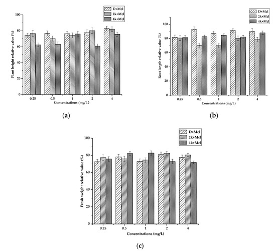 Plant height (a), root length (b), and fresh weight (c) relative values of 0.25 μM metolachlor (Mcl)-treated rice plants treated with compounds 2k, 4k, and dichlormid (D) at 0.25 mg/L, 0.5 mg/L, 1 mg/L, 2 mg/L, and 4 mg/L, respectively. The values present the means of three replicates ± SE of each mean.