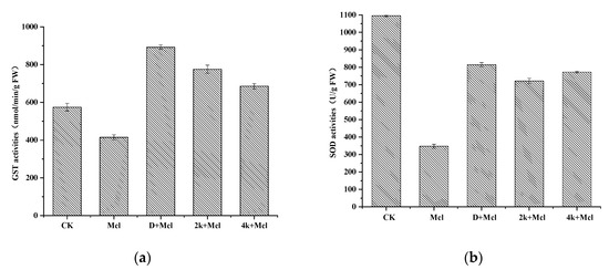 GST can catalyze the conjugation of GSH and herbicide molecules in crop plants, which subsequently improves the tolerance of crop plants to herbicides [46]. As shown in Figure 3a, GST activity decreased significantly after the treatment of metolachlor on rice seedlings. However, the results of the present study demonstrated that the GST activities of rice seedlings treated with a combination of compounds 2k and 4k with metolachlor were greater than that of rice seedlings treated with metolachlor alone and even higher than that of control check (CK). Except for dichlormid, rice treated with compound 2k exhibited the best GST activity, which was almost 187% of the metolachlor-treated group and 1.16 times of CK.
