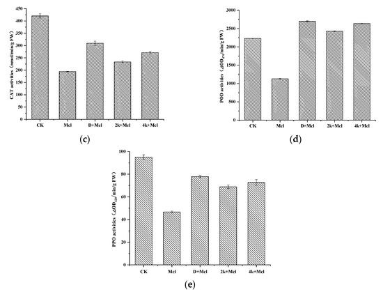 To minimize toxicity caused by herbicides, crop plants have evolved their own protective mechanisms, for instance, the antioxidant system that is comprised of a series of enzymes, such as superoxide dismutase (SOD), peroxidase (POD), and catalase (CAT) [47,48,49]. These antioxidant enzyme activities have also been reported to be associated with herbicide tolerance in crop plants [28]. When rice seedlings were only treated by metolachlor, SOD, POD, and CAT activities decreased significantly, compared to that of CK (Figure 3b–d). After the addition of compounds 2k and 4k, the SOD, POD, and CAT activities increased dramatically. For 2k treatments, the SOD, POD, and CAT activities increased by 208%, 120%, and 215%, respectively; for 4k treatments, the SOD, POD, and CAT activities increased by 223%, 140%, and 233%, respectively. These results indicated that 2k and 4k could induce antioxidant enzyme activities that were inhibited by metolachlor.
