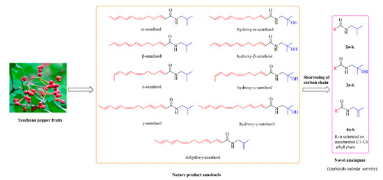 Sanshools are N-alkyl substituted compounds extracted from the Zanthoxylum species. Sanshools are well-known as spices and have several essential physiological and pharmacological functions. Sanshools and hydroxyl-sanshools are TRPV1 (a thermosensitive transient receptor potential ion channel vanilloid) agonists in sensory neurons, exhibiting pungent quality [32,33]. TRPV1 also shows an inhibition effect on an NF1- and p53-deficient mouse glioma cell line, indicating their potential antitumor activity [34]. Especially, hydroxy-α-sanshool can enhance the activity of the cholinergic system and increase the CREB/BDNF signaling pathway to attenuate scopolamine-induced cognitive impairments [35]. Besides, hydroxy-α-sanshool may also block KCNK9 channels to induce colonic motor activity in the rat proximal colon [36]. Naturally occurring products provide an excellent basis for the discovery of novel pesticides, including insecticides, fungicides, herbicides, and even herbicide safeners [18,25,37,38]. In our previous study, a mixture of sanshools consisting of hydroxy-α/β/ε-sanshool, α/β/ε-sanshool, γ-sanshool, hydroxyl-γ-sanshool, dehydro-γ-sanshool, and dihydroxy-α/β-sanshool (Figure 1) was extracted from Szechuan pepper fruits by the supercritical fluid extraction (SFE) method. Interestingly, the mixture demonstrated good herbicide safener activity for metolachlor in rice seedlings. However, the use of SFE to extract large quantities of sanshools is not cost-effective. Meanwhile, the reported procedures for organic synthesis of some of these sanshools are relatively complicated, mainly because of the construction of unsaturated long alkyl carbon chains with specific double-bond configurations in the carbon terminal of the amide bonds [39,40,41,42,43]. These factors have further limited the application of sanshools as herbicide safeners, indicating that their structures need modification (including simplification of the structures).