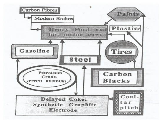 In terms of the history of the carbon industries, carbon blacks impinge into our story. Although dominantly associated with printing inks, carbon blacks are an essential ingredient of the automobile tyre. Aircraft use braking systems of carbon composites made up of carbon fiber matrices bonded with carbon from coal-tar pitch. Also, the steel industry makes its steels in the furnace heated using the grafite electrode, made from premium quality delayed coke (needle coke) and coal-tar pitch. In the present century, sophisticated carbon electrodes have been manufactured for many applications, namely in the area of electrochemical energy devices [6,7,8].
