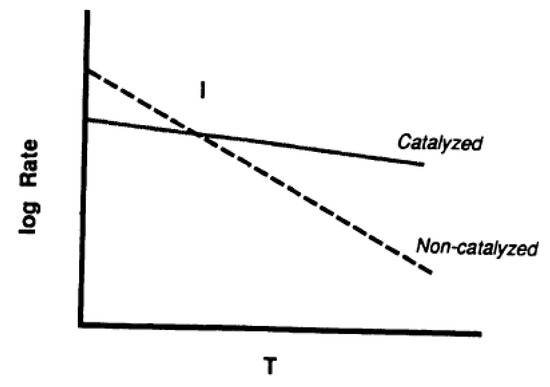 A catalyst usually provides an alternative route for the uncatalyzed reaction, with a certain (original) activation energy. The slow stage (rate determining step) of that alternative route has a lower activation energy [51]. Then, this decrease in activation energy, E, results in an increase in reaction rate, which is accompanied by a corresponding change in the pre-exponential factor, A, called compensation effect. E and A obey an equation of the form