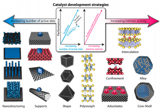 Figure 9 schematizes various catalyst development strategies [83], which can ideally be addressed simultaneously, leading to the greatest improvements in activity. However, high catalyst loadings can affect other important process such as charge and mass transfer [83], as shown by the plateau in Figure 9, observed at high loadings. Moreover, as illustrated in Figure 9, further strategies can be exploited for catalyst improvement as nanostructuring, adsorption, support modification, polymorphism, confinement, alloying, sheping, doping, intercalation, chemical functionalization, etc. [84,85,86,87].