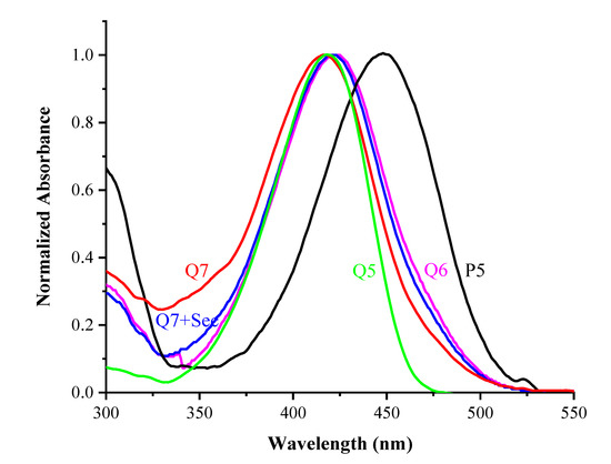 As shown in Figure 1, the Q6 dye displayed the maximum absorption at 422 nm (pink), while the maximum absorbance of energy acceptor P5 peaked in the region of longer wavelength around 448 nm (black). Meanwhile, the maximum absorption peak of Q7 sensor was around 418 nm (red), which was similar to that of donor fluorophore Q5 (green). Additionally, the solution of sensor treated with Sec exhibited an absorption peak around 421 nm, which was similar to that of Q6. All the results of UV-vis spectrum analysis indicated the hydroxy group of Q6 had been blocked by 2,4-dinitrobenzene sulfonate ester and might be recovered by the reaction with Sec.