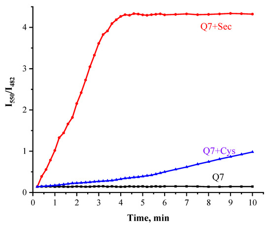 Effect of time on Fluorescent intensity ratios I550/I482 of 1 µM Q7 (black), Q7 reacting with 100 μM Sec (red) and Q7 reacting with 1 mM Cys (blue) in DMSO/PBS = 1:99 (v/v), excited at 400 nm.