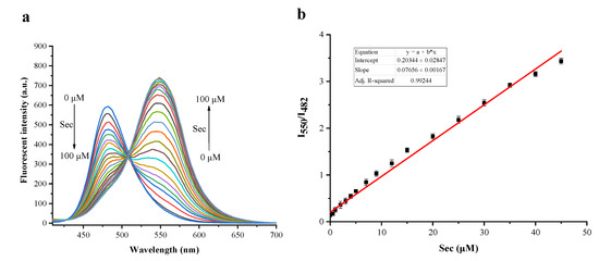 (a) Fluorescence intensity variation of 1 µM Q7 to different Sec concentrations (0, 0.5, 1, 2, 3, 4, 5, 7, 9, 12, 15, 20, 25, 30, 35, 40, 45, 50, 60, 70, 80, 90, 100 µM). (b) The linear relationship of the fluorescent intensity ratios I550/I482 of 1 µM Q7 and Sec concentrations, excited at 400 nm.