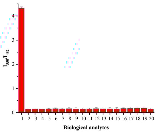 Fluorescent intensity ratios I550/I482 responses of 1 μM Q7 to biological analytes (1 mM). Legend: (1) Sec; (2) Blank; (3) Hcy; (4) GSH; (5) Cys; (6) Pro; (7) Glu; (8) Asp; (9) Phe; (10) Thr; (11) Val, (12) Leu, (13) Arg; (14) Ile; (15) Ser; (16) Trp; (17) Lys; (18) His; (19) Na2SeO3; (20) Na2Se. Excitation at 400 nm. Each data point was detected after mixing for 4 min.