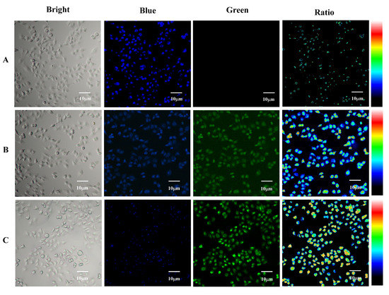 Inspired by the excellent sensing properties and anti-interference ability, we next investigated the cytotoxicity and fluorescence imaging capability of Sec determination by Q7 sensor. As shown in Figure S15, the cell viability was maintained at over 80% when pre-cultured by 0–10 μM sensor solutions, which meant that the sensor Q7 exhibited barely obvious cytotoxicity and was able to be applied in a living cell model. Although the concentration of Sec is very low in normal human cells, its concentration will increase in the presence of some physiological diseases, such as thyroid cancer, which can be detected and recognized by fluorescence sensors [17,28]. To investigate fluorescence detection capability of Q7 in living cells, a rationmetric fluorescence imaging test was carried out.