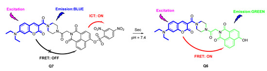 In this study, a new FRET-ICT dual-modulated ratiometric fluorescence sensor Q7 was designed and prepared by introducing 2,4-dinitrobenzene sulfonate ester to a FRET ratiometric fluorophore Q6, which was constructed by coumarin as a donor fluorophore with hydroxy naphthalimide fluorophore as energy receptor through a piperazine linker. The sensor Q7 exhibited only a blue fluorescence signal, and displayed two well-distinguished emission bands (blue and green) in the presence of Sec with ∆λ of 68 nm. Moreover, Q7 has the capability of quantitative detection of Sec at concentrations ranging from 0 to 45 μM (limit of detection = 6.9 nM), whose detection limit is lower than those of the reported sensors [19,21,22,24,25,35,36,37]. The response time of Q7 to Sec is 4 min, which is faster than those of the reported sensors [19,22,25,35,37]. In addition, the sensor Q7 can be used for rationmetric fluorescence imaging in living cells. Herein, we speculated that this novel FRET-ICT dual-modulated ratiometric fluorescence sensor will be able to be applied to a wider field of biomedical diagnostics.