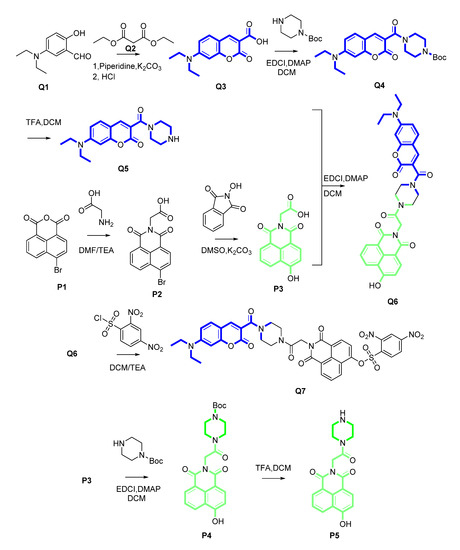The energy donor Q5, energy acceptor P5, fluorophore Q6 and the ratiometric fluorescent sensor Q7 were synthesized as shown in Scheme 2.
