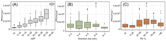 Figure 1 represents the boxplot figures of the changes in the PPC within different structural classes of PAs (mDP and PD-%) and retention time (tR) windows. The retention times of the semi-preparative fractions were obtained at the peak top times of the chromatograms at UPLC (λ = 280 nm). Even though, the retention time itself is not a structural feature, it is still greatly affected by the structural features of the PAs, such as PD-% [33]. Thus, it is one of the key variables in the study of PA fingerprints. The variables were categorized to produce the boxplot figures and to better estimate the distribution of the PPC within the variables (Figure 1).