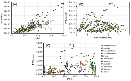 In the complete data set, a similar linear correlation between the PPC and PD-% or tR (Figure 2B,C) was not observed, as in the case of the mDP. Supplementary Figures S2 and S3 show the species-specific tR and PD-% scatter plots of the PPC. The correlation between the PPC and PD-% was negative in the majority of the plant species. For instance, the most PD rich plant species in this study showed that the most PD rich fractions (PD-% > 98%) had the lowest PPC of the aforementioned plant species. Such plant species were L. vulgaris (Figure S2G), S. phylicifolia (Figure S2I), R. alpinum (Figure S2J), and T. repens (Figure S2K). Possible explanations for the low PPC of the most PD-rich fractions could be their relatively small mDP as compared to the rest of the fractions. For instance, the low PPC fractions (PPC < 2.0 × 103 m2 mol−1) of R. alpinum, which were high in PD-% (PD-% > 98%, Figure S3I) were also low in mDP (mDP < 12, Figure S1I). The comparison of the mDP and PD-% revealed that in S. phylicifolia, T. repens, and R. alpinum, the mDP increased as the PD-% decreased (Supplementary Figure S4). Such cases, where the mDP and PD-% share a negative dependence, cannot be generalized, since it was more common for the PD-% to increase, while the mDP increased (Supplementary Figure S5). Especially in the highly PC or PD pure plant species, such as A. hippocastanum, T. medium, R. alpinum and T. repens the negative correlation of the PD-% and PPC should be considered as tentative result due to the relatively low variation of PD-%.