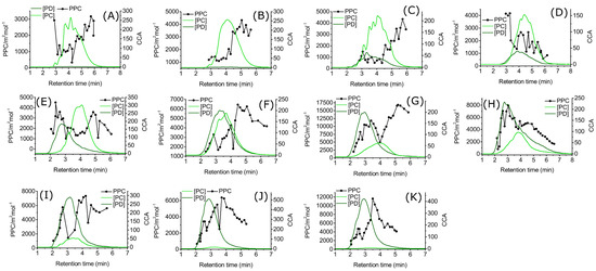 There was one more pattern where the PPC “followed” the shape of the PA fingerprint, and the PPC maximum was at the concentration maximum or shifted approximately 0.5 min to the latter retention time. Such plant species were L. corniculatus (Figure 4F), P. sylvestris (Figure 4H), R. alpinum (Figure 4J), and T. repens (Figure 4K). Interestingly, all of these plant species contained more PD than PC units (PD-% = 55%, 76%, 97%, and 98%, respectively). The highest PPC values of R. alpinum and T. repens (Figure 4K) were at the descending part of the PA fingerprint at tR = 3.7 min and tR = 3.5 min, respectively. This suggests that the most active compounds of R. alpinum and T. repens were not the most abundant ones, since the maximum responses of the PA fingerprints were approximately at tR = 3.0 min. The PPC followed a similar pattern in L. corniculatus (Figure 4F), where the maximum of the PPC was at tR = 4.6–5.1 min, and the maximum of the PA response was at tR = 3.2–3.7 min. In both cases, the most active compounds were at the descending part of the PA fingerprint at late retention time. In the PA fingerprint of P. sylvestris (Figure 4H), the PPC pattern followed the shape of the PA fingerprint, suggesting that the most abundant compounds are also reliable for the PPC.