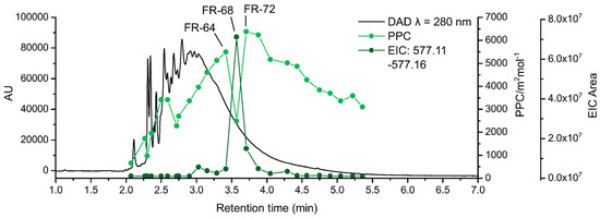 Interesting points in the tR–PPC scatter plots were examined more closely with high resolution mass spectrometric data. Figure 5 shows the distribution of PPC within a chromatographic hump (λ = 280 nm) of R. alpinum. The PPC decreased significantly at tR = 3.4–3.8 min (fraction numbers 64, 68, and 72, Figure 5). The high-resolution mass spectra of the corresponding fractions 64, 68, and 72 (Figure S7) were interpreted to identify the possible causes for the dramatic decrease in the PPC. The PA oligomers and polymers in these fractions were mainly PD rich or PD pure compounds with a degree of polymerization ranging from two to nineteen. The most considerable difference within these three spectra was the presence of a dimeric B-type procyanidin (PC) in fraction 68, which also had the lowest PPC. An extracted ion chromatogram (EIC) of the dimeric PC (m/z = 577.11–577.16) was generated for all R. alpinum fractions resulting in the abundance of PC dimer per each fraction. Since the analyzed fractions were pure PAs, the desired EIC response was considered to originate from the dimeric PC only (m/z 577.13486, elemental composition C30O12H26, mass error −0.501 ppm).
