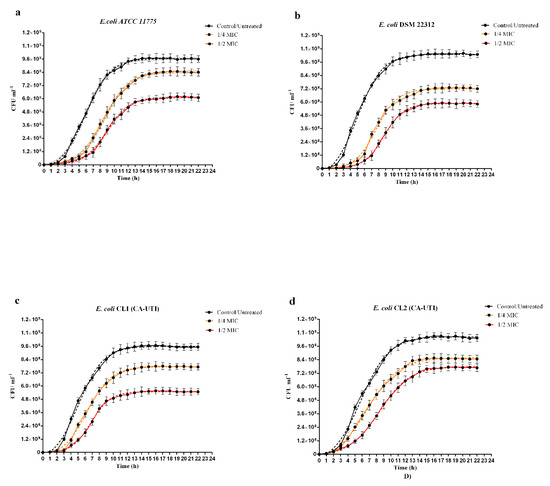 As shown in Figure 1 for all strains tested, the effect of berberine on in vitro growth and delay in reaching the exponential growth phase was both concentration and strain-dependent. As regards the inhibition rates (% inhibition), both concentrations of berberine reduced the in vitro growth in all tested strains. The highest percentage of inhibition was observed for E. coli DSM 22312 treated with 1/2 MIC of berberine (43.03%) (Figure 1b and Table 2) while the lowest percentage was observed for E. coli ATCC 11775 treated with 1/4 MIC (12.47%) (Figure 1a and Table 2). In all curves (Figure 1), a delay in reaching the growth exponential phase (∆XCFU50) was observed, the highest delay value was recorded for E. coli DSM 22312 (3.7 h) (Table 2) and the lowest for E. coli CL2 (0.9 h) (Table 2). The steepness of the curve (HillSlope) exerted by berberine was the slightest bit different for all strains. Indeed, berberine administration on E. coli ATCC 1775, E. coli DSM 22312 and E. coli CL1 showed a small increase in the steepness of the curve compared to the untreated control (Table 2), in contrast, for E. coli CL2, the hillslope values decreased (−0.03 for 1/4 MIC and −0.02 for 1/2 MIC) (Table 2).