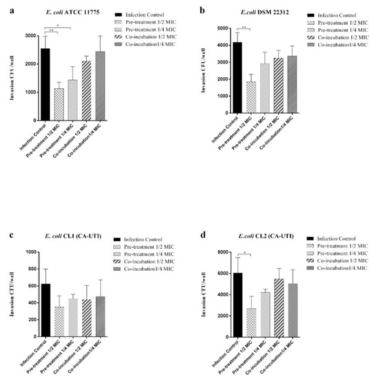 As shown in Figure 3, the pre-treatment with berberine 1/2 MIC significantly reduces the ability of E. coli ATCC 11775, E. coli DSM 22312 and E. coli CL1 to invade the bladder cell line. Pre-treatment with 1/4 MIC berberine significantly reduces invasive capacity only for E. coli strain ATCC 11775. As regards E. coli CL1, a non-significant reduction in invasion assay for both tested berberine concentration was observed. Co-incubation treatments, as well as adhesion assay, did not alter the invasive ability of the tested strains.