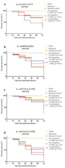 The E. coli infection without berberine treatment caused the death of 76.64% larvae for E. coli ATCC 11775, 100% for E. coli DSM 22312, 75.73% for E. coli CL1 and 100% for E. coli CL2 within 72 h.