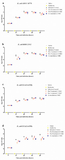 For co-incubation treatment, bacterial suspensions of E. coli strains were diluted at the concentration of 108 CFU/mL in MH broth and incubated at 37 °C without berberine chloride for four hours.