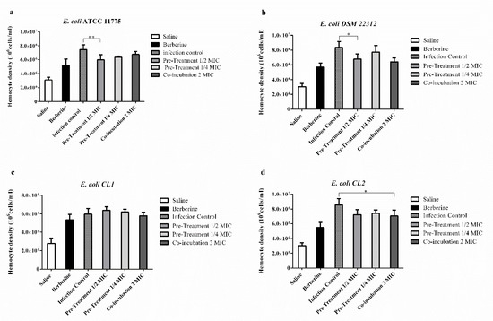 The effect of berberine on G. mellonella immune response was evaluated by hemocyte enumeration. After 48 h of exposure to berberine alone, the hematocyte count increased, but not significantly. In larvae infected with E. coli ATCC 11775 and E. coli DSM 22312, a significant reduction in the haematocytes count was observed in the pre-incubated group (1/2 berberine MIC) compared to untreated larvae. Meanwhile, in larvae infected with E. coli CL2, a significant reduction of the co-incubated group compared to the infected group was found (Figure 6).