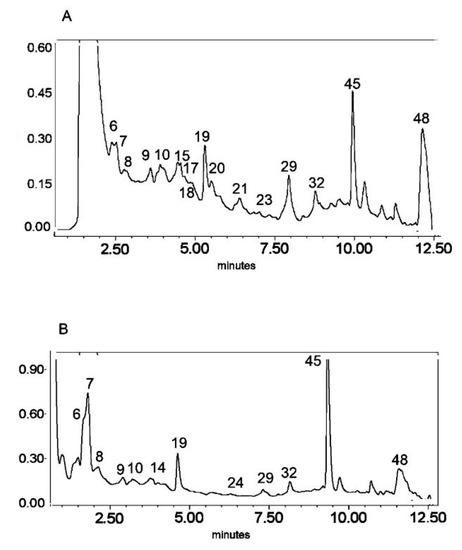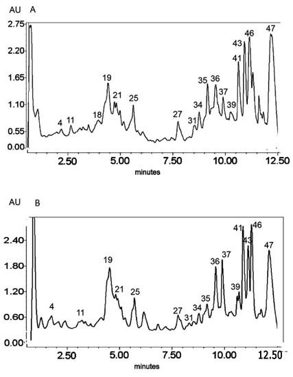 | 6 | 8.7 | 610 | 609, 447, 327 | isoorientin 7-O-glucoside | * | C27H29O16 | 609.1456 | 609.1477 | −3.521 | 170474254 | 1 (std) * | [26] | ||
