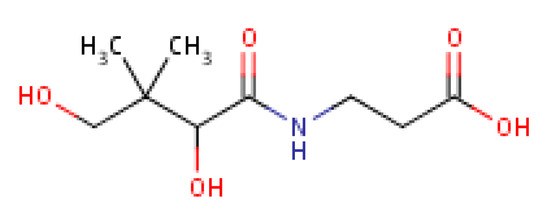 Pantothenic acid, whose molecular structure is shown in Figure 9 is also known as Vitamin B5. This micronutritional factor is essential for the metabolism of fatty acid. Pantothenic acid has anti-stressor properties which also contribute to the production of neurotransmitters [97]. The body’s stress resistance capacity is boosted by pantothenic acid through the build-up of antibodies and it as well enhances central nervous system development [97,98].