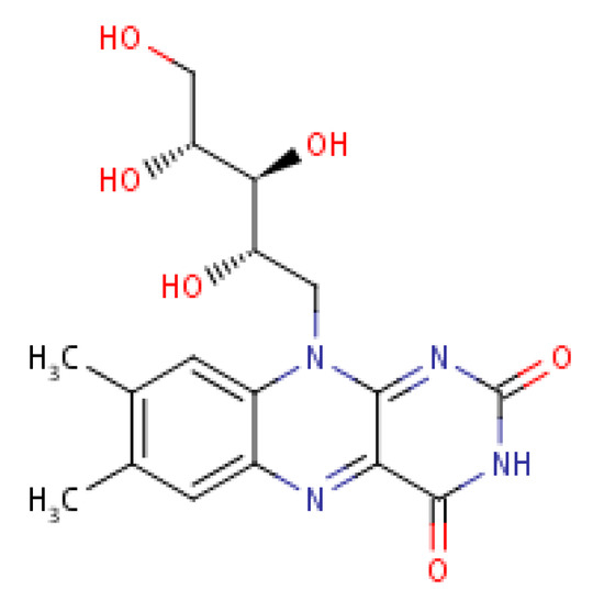Riboflavin (Vitamin B2) is thought to be implicated in the differentiation and functionality of immune cells by regulating the oxidization of fatty acid [87]. Dietary riboflavin contributes to the generation of inflammatory and immunity signalling molecules within immune cells through the mechanism of NADPH oxidase 2 priming [99]. Riboflavin exhibits anti-inflammatory capacity by suppressing the nuclear factor (NF-kB) activity [100]. Its structural molecular entity is depicted in Figure 10.