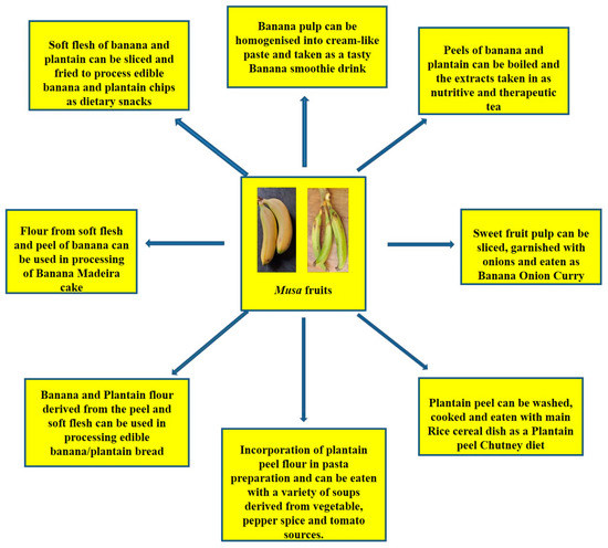 Banana (M. sinensis L.) is a tree-like, perennial herb. The term banana was developed out of “banan” of Arab origin (i.e., “finger” in translation) [26]. It was introduced to parts of western Africa (Guinea) from Portugal, with the first domestication of banana in South-eastern Asia [27]. The plantain (M. paradisiaca L.), similar to the unripe banana, is larger, has a starchy flesh and can be used in the unripe and cooked forms. It is a tropical staple, ranked the tenth most important in the world and contains more starch and less sugar than a banana. The mature, yellow variety can be peeled as is typically done with banana.