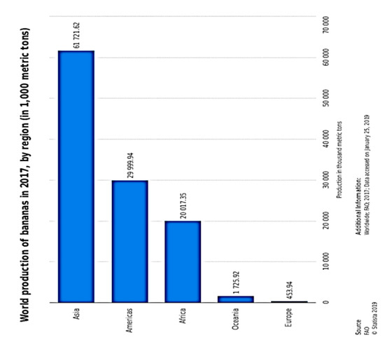 Global production of banana showing dominant banana output in the Asian, American and African continents [212].