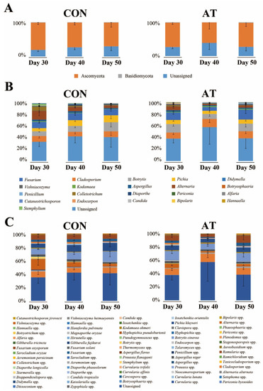 The kimchi fungal community profiles at the phylum (A), genus (B), and species (C) levels in the control group (CON) and the ampicillin-treated group (AT) during 30 to 50 days of fermentation as revealed by internal transcribed spacer 2 (ITS2) sequencing. The x-axis represents different samples. The y-axis represents the percentage abundance of fungus in each sample.