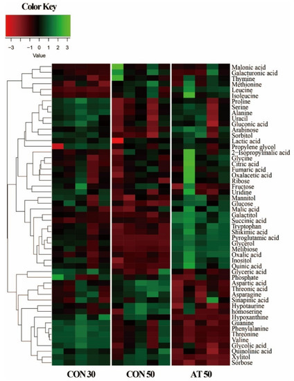 To investigate metabolic changes in the kimchi samples during fermentation by the administration of ampicillin, principal component analysis (PCA) was performed using GC-MS data for control groups (CON30 and CON50) and the ampicillin-treated group (AT50) (Figure 3A). A clear separation of samples between day 30 and day 50 was observed in the PCA score plot, indicating that the metabolic profile was changed by the fermentation period. On the 50th day of fermentation, kimchi samples were also separated by the administration of ampicillin, suggesting that the administration of ampicillin changed the metabolites in kimchi by affecting the growth of kimchi bacteria.