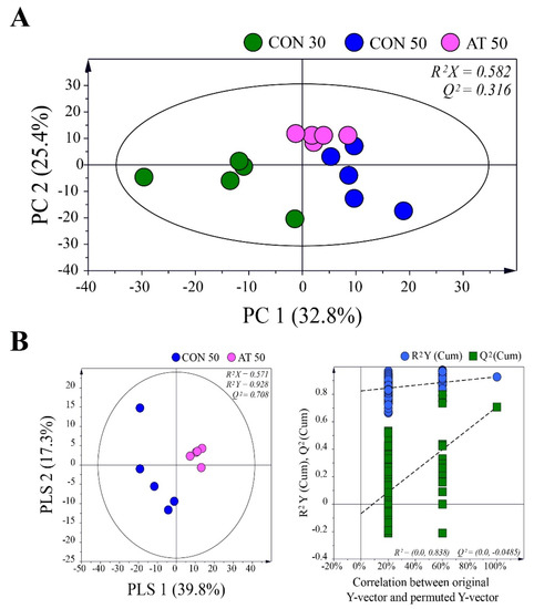 (A) Principal component analysis (PCA) score plots derived from gas chromatography-mass spectrometry (GC-MS) data for control groups (CON30 and CON50) and the ampicillin-treated group (AT50) during kimchi fermentation. (B) Partial least squares-discriminant analysis (PLS-DA) score plot between the CON50 and AT50 groups after 50 days of fermentation validated by a permutation test.