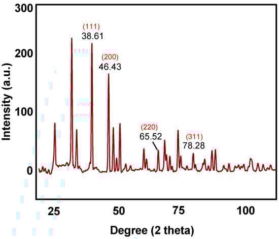 The XRD diffraction patterns of as-obtained AgNPs is manifested in Figure 1. The Braggs reflections noticed at 2θ = 38.61°, 46.43°, 65.52° and 78.28° correspond to (111), (200), (220) and (311) lattice planes, respectively which can be further attributed to the face centered cubic crystal structure of silver. Furthermore, the XRD pattern revealed the crystalline nature of as-obtained AgNPs.