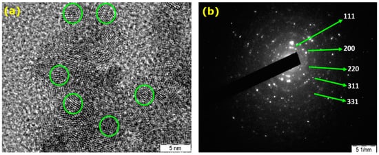 The morphology and the size of the green synthesized AgNPs was investigated by High Resolution Transmission Electron Microscopy (HR-TEM) analysis. Although, previous reports mention the different morphology of AgNPs synthesized using a similar method [25], in our synthetic strategy, the as-prepared AgNPs is typically spherical in shape (Figure S1). The as-obtained AgNPs exhibited well-defined structures in nanoscale dimensions with typical spherical morphologies as depicted in Figure 2a, with an average particle size of 22 nm. As manifested in Figure 2a, the lattice fringes having inter planar distance of 0.31 nm, which is assigned to (111) plane. Furthermore, the crystallographic features of the as-prepared AgNPs was analyzed by Selected Area Electron Diffraction (SAED) studies. It is evident from SAED image (Figure 2b) that few spots of diffraction are spread in concentric circles, when the electron diffraction was performed on a limited number of crystals. The ring patterns observed for as-prepared AgNPs having plane distances of 2.39 Å, 2.07 Å, 1.45 Å, 1.25 Å, and 0.97 Å are in good agreement with the planes those could be indexed to (111), (200), (220), (311), and (331) of pristine face centered cubic silver structure (JCPDS file No. 4-0787). Moreover, these results are in consistent with the XRD pattern also.