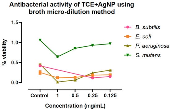 The as-prepared AgNPs showed considerable dose-dependent antibacterial activity against the tested pathogenic bacterial strains. The measured zone of inhibition (Table S1; Figure S2) suggested that, B. subtilis was more sensitive to the AgNPs, followed by P. aeruginosa; while E. coli and S. mutans showed comparatively minimal sensitivity toward the AgNPs. This was also confirmed from the MIC of AgNPs measured against these bacteria (Figure 3). B. subtilis showed the least MIC than others. This could be explained by higher affinity of B. subtilis cells to colloidal AgNPs than the other tested bacterial strains [26]. These results showed that as-prepared AgNPs has significant effect on growth inhibition of Gram-negative bacteria than that of Gram-positive bacteria. This might be due to differences in the structure and composition of the cell wall of these bacteria [27]. Compared to the respective control (Table S2), the order of the observed antibacterial activity could be listed as B. subtilis > P. aeruginosa > E. coli > S. mutans. Antibacterial activity occurs in two steps; firstly phytochemicals adhered on the surface of AgNPs cause damage to the outer cell membrane by damaging the cell wall proteins which causes leakage of cellular matter. According to the widely accepted mechanism, the AgNPs enters into cell membrane, which rupture and the intracellular substances leak, which in turn affects the respiration process by inactivating the respiratory chain dehydrogenases and finally inhibits the respiration, as well as bacterial growth [28].