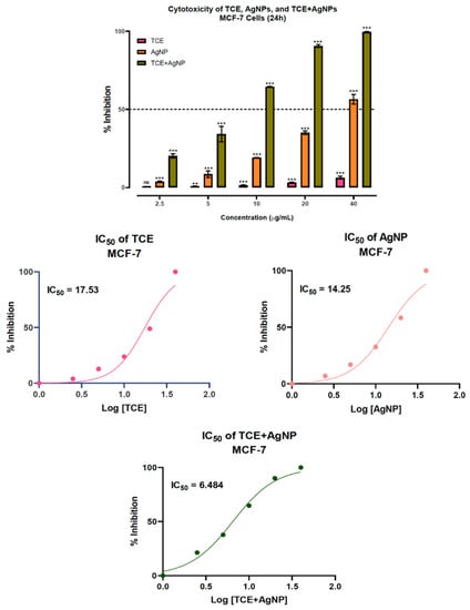 TCE was found to be cytotoxic to the MCF-7 in a dose-dependent fashion. Notwithstanding this, high concentrations of TCE were required to show a significance in the observed anti-proliferative effect, compared to the AgNPs. However, the TCE-mediated preparation of AgNPs drastically enhanced the tumoricidal potential of the constituents even at very low concentrations. The IC50 values of 17.53 and 14.25 µg/mL were recorded for the separated treatments of MCF-7 with TCE and AgNPs (Figure 4). Surprisingly, significant reduction of the IC50 to 6.484 µg/mL, which is almost one third of TCE and half of AgNPs treatments, was observed in the TCE + AgNPs treatment of MCF-7 cells. Suggesting that the preparation of AgNPs using TCE enhanced the cytotoxic behavior. Similar observations were made by Satpathy et al. (2018), where the green synthesis of AgNPs using P. tuberosa extracts enhanced the cytotoxicity against breast, ovarian, multidrug resistant and brain cancer cell lines [29]. Patra et al. (2018) endorsed and suggested such improvement in biological activities in the medicinal plants when in combination with a metal nanoparticle. In this study, the bio-conjugation of AgNPs with Saraca asoca not just improved the anticancer, but also the antibacterial, antidiabetic as well as catalytic activities of the plant extract [30].
