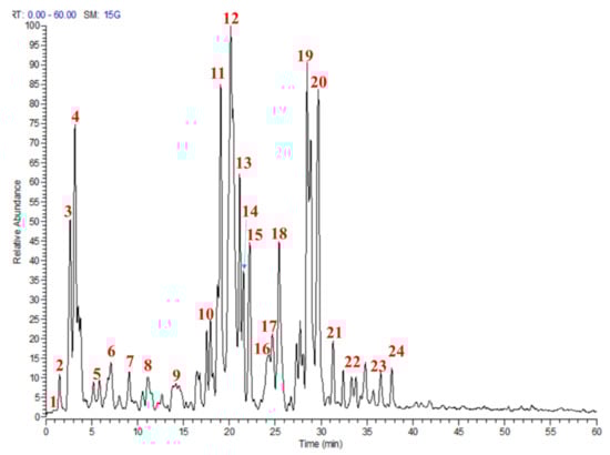 Utilizing a bio-guided assay, the most bioactive fraction from M. sinaica (MS-3) was identified, and the secondary metabolites were characterized based on their molecular weights, mass fragmentation and retention times using LC-MS/MS. Altogether, 24 compounds were annotated; among them, flavonoid glucosides (isorhamnetin, quercetin and kaempferol) dominated the fraction (Table 1 and Figure 1).