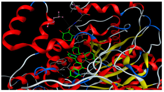 The inhibition of prostaglandin biosynthesis is one of the major mechanisms involved in the anti-inflammatory activity of nonsteroidal anti-inflammatory drugs (NSAIDs) [27]. For the sake of discovering safer natural alternatives of NSAIDs, further studies are still in demand to identify novel bioactive constituents in different plants extracts, evaluate their anti-inflammatory potentials and clarify their mechanisms of action [28]. In these regards, the polyphenols identified in the M. sinaica (MS-3) fraction were docked to the cyclooxygenases (COX-1 and COX-2), which are two key enzymes in inflammation signaling, as they catalyze the very first step in prostaglandins synthesis from the precursor arachidonic acid [29]. The docked compounds were able to bind to the COX-1 and COX-2-binding pockets and afforded similar amino acid interactions compared to the co-crystallized ligands. As shown in Table 7, the quercetin derivatives did not show significant selectivity towards any of the two enzymes; however, the isorhamnetin and kaempferol derivatives showed to be more selective to COX-2. Isorhamnetin 3-O-β-glucopyranoside-7-O-α-rhamnopyranoside showed scoring function values of −21.69 and −27.94 kcal/mol for COX-1 and COX-2, respectively, whereas kaempferol-3-O-β-(2″-O-glucosyl)-rutinoside showed scoring function values of −23.04 and −27.49 kcal/mol for COX-1 and COX-2, respectively.