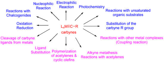 The alkyne (carbon-carbon triple bond), which is a fundamental functional group in organic chemistry, is involved in a large number of reactions in organic chemistry [1,2,3,4,5]. Carbyne complexes, i.e., transition metal complexes with metal-carbon triple bonds, can be described as analogs of alkynes, whereas a transition metal replaces one of the sp carbons. They have attracted considerable attention because of their remarkable features and their significance as catalysts or reagents for various types of organic transformations [5,6,7,8,9,10,11]. Part of the reactivities of carbynes paralleled that of their organic parents, such as nucleophilic reactions, electrophilic reactions, photochemistry, oxidation and reduction, reactions with chalcogenides, reactions with unsaturated organic substrates (cycloadditions) and substitution on the α carbon (Figure 1). However, the incorporation of metal into the triple would lead to fascinating properties, which were quite different from organic alkynes. For example, late-transition-metal carbyne species were applied as catalysts in alkyne metathesis or alkyne polymerization reactions. Carbynes might be coupled or reactive to other metal complexes to afford bi- or multi-metallic complexes. Ligand substitution is one of the fundamental reactions in organometallic chemistry, which is certainly involved in the reactions of carbynes. In addition, carbyne ligands might be cleaved from metal centers to give various organic products (Figure 1).