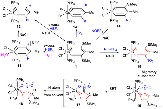 Trimethylsilyl group (TMS) was usually recognized as the “equivalent” of cationic hydrogen and labile to electrophiles in organic reactions. In the presence of excess tetrafluoroboric acid and water, metallabenzyne 1 [30] was converted to cationic metallabenzyne 11 via electrophilic desilylation and subsequent ligand exchange. Sodium chloride would provide anionic chloride ion to avoid ligand exchange to facilitate the formation of neutral desilylated osmabenzyne 12. Treatment of isolated 11 with NaCl also gave 12. Bromination of metallabenzyne 1 with excess elemental bromine readily provides brominated osmabenzyne 13, in which both the Me3Si and Cl in 1 have been replaced by Br [41]. Nitrosation of metallabenzyne 1 was carried out in the presence of excess nitrosonium salt (NOBF4) and sodium chloride at low temperature to furnish osmabenzyne 14 in which the SiMe3 substituent at C4 was replaced by NO [44]. Nitration of metallabenzyne 1 took place at C4 to afford osmabenzyne 15 under similar reaction conditions except that nitronium salt (NO2BF4) was applied. Surprisingly, the biclyclic species 18 was isolated together with osmabenzyne 15. A plausible mechanism was rationalized. Initially, electrophilic substitution of NO2+ produced osmabenzyne 15, which might undergo migratory insertion reaction and coordination of anionic oxygen atom to give intermediate 16. Subsequent single electron transfer generated the radical 17, which would abstract a hydrogen atom from solvent to give the osmium complex 18 [44]. The reactions of osmabenzyne 1 is summarized in Scheme 2.