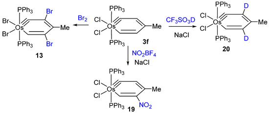 It is well known that C-SiMe3 bonds on an aromatic ring are more reactive than C-H bonds towards electrophiles. In order to further investigate the reactivity of metallabenzynes without SiMe3 group, osmabenzyne 3f was subjected to electrophilic conditions (Scheme 3). Bromination and nitration were carried out under similar conditions and provided the identical brominated product 13 and mononitrated osmabenzyne 19, respectively [44]. Treatment of osmabenzyne 3f with CF3SO2D in the presence of sodium chloride produced 3,5-dideuterated osmabenzyne 20 [41], which indicates that the carbons of OsC or OsCH were not attacked by the acid under the protonation condition.