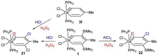 Chlorination of osmabenzyne 1 and 3f with excess HCl/H2O2 furnished the same 3,5-dichlorinated product 21, while C2 monochlorinated product 22 could be obtained when the ratio of AlCl3/H2O2 was carefully controlled [44]. Noteworthy is that the carbyne moiety was attacked by oxygen atoms in the presence of hydrogen peroxide to afford metalla-oxirene fragments in the chlorination reactions (Scheme 4).
