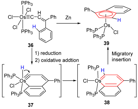 Metallabenzenes and metallabenzynes usually exhibit rearrangement to the corresponding cyclopentadienyl complexes, which is the major decomposition pathway. The migratory insertion step involves reductive elimination, in which the two carbon atoms adjacent to metal undergo the coupling reaction to form cyclopentadienyl moiety. In 2007, Jia and Lin [37] discovered that reduction of complex 36 and subsequent cyclometallation gave hydrido osmabenzyne intermediate 37, which underwent hydride shift to attack the carbyne carbon to afford metallabenzene intermediate 38. Intermediate 38 would undergo migratory insertion reaction and subsequent rearrangement to afford cyclopentadienyl (Cp) complex 39 (Scheme 7).