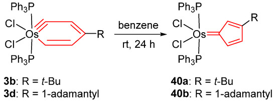 Metallabenzynes could also undergo migratory insertion reactions to give carbene complexes. The substituent effect was illustrated by Jia and Lin. As depicted in Scheme 8, osmabenzynes bearing bulky substituents (t-butyl or 1-adamantyl) para to the metal center would slowly convert to the corresponding osmium carbene complexes 40a and 40b at room temperature in solution [38]. The steric hindrance of the bulky substituents might prevent the osmium carbene complexes from further transformation [45,46].