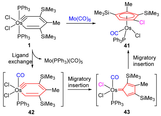 The ligand effect played an important role in the rearrangement of osmabenzyne 1 to the corresponding cyclopentadienyl complex 41, which was demonstrated by Jia [43] as shown in Scheme 9. Ligand exchange reaction of stable osmabenzyne 1 with Mo(CO)6 would replace one phosphine ligand with carbon monoxide and deliver reactive osmabenzyne intermediate 42, which underwent migratory insertion involving the two metal-bonded carbons to give the carbene intermediate 43. Migratory insertion of the carbene into the Os-Cl bond in 43 with a subsequent rearrangement to η5 coordination would furnish Cp complex 41.