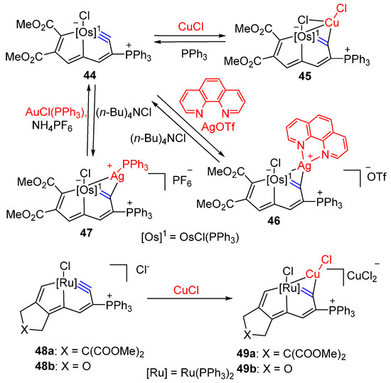 The metal-carbon triple bond possesses an “alkyne-like” character and can react with an external metal precursor to generate bimetallic adducts, in which osmium-carbon triple bond coordinated with the coinage metal center. Xia reported that osmapentalyne 44 [48] was treated with cuprous chloride to afford hetero bimetallic adduct 45, in which the chloride bonded to osmium also coordinated with copper atoms. As different silver or gold precursors were subjected to osmapentalyne 44, the corresponding hetero bimetallic adduct 46 or 47 was formed in a similar way. The interaction between cyclic osmacarbyne with coinage metal is weak, which is supported by the fact that in the presence of ligands (PPh3 for 45 or (n-Bu)4NCl for 46–47) the bimetallic complex readily dissociates and osmapentalyne 44 would be regenerated (Scheme 10) [53]. Ruthenapentalynes 48a–b readily reacted with CuCl to afford similar bimetallic complexes 49a and 49b, except that the chloride bonded to ruthenium did not coordinate with copper [52]