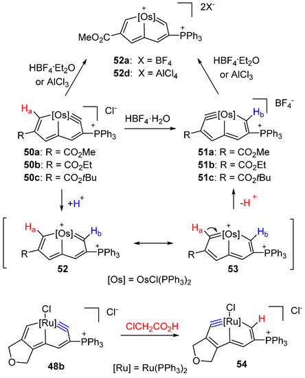 Upon treatment of osmapentalynes 50a–c [47] with HBF4·H2O at room temperature, the metal–carbon triple bond could shift from one ring to another to generate osmapentalynes 51a–c [54]. The plausible mechanism was that the osmapentalyne was protonated to give the osmapentalene intermediate 52 bearing a 16-electron osmium center, which was not stable enough according to the 18-electron transition metal rule. Subsequent elimination of Ha would furnish osmapentalynes 51a–c with an 18-electron osmium center. Fortunately, the 16-electron osmapentalenes, complex 52a and 52d, were captured and characterized by the reaction of osmapentalyne 50 or 51 with HBF4·Et2O or AlCl3 (Scheme 11). The metal carbyne bond shift reaction of the ruthenapentalyne 48b is similar to that of osmapentalynes, as is the mechanism [52].