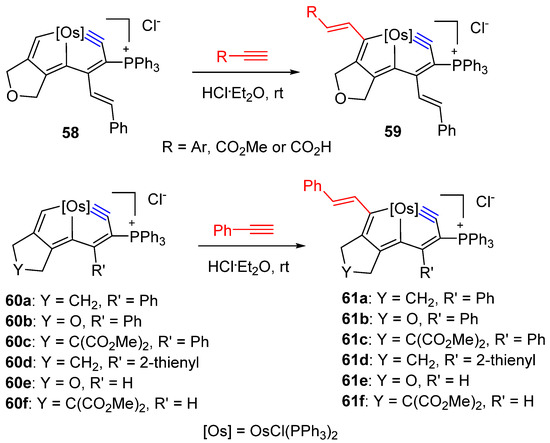 The reactions of metal carbynes and carbon–carbon triple bonds tended to provide cycloaddition intermediates or products. In contrast, Xia and coworkers documented a fantastic reaction between osmapentalynes and terminal alkynes in 2020, giving rise to acyclic addition products 59 and 61 (Scheme 13) [57]. High efficiency, regio- and stereoselectivity were observed, furnishing exclusively trans and anti-Markovnikov products in excellent yields. These reactions possess good functional tolerance for both alkynes and osmapentalynes and are easy to handle (air atmosphere and ambient conditions). The plausible mechanism is the electrophilic addition of cyclic carbyne by the terminal alkynes under the synergistic effect of protons on the basis of experimental observations as well as theoretical calculations. The application of the reactions provides an easy access to functionalized dπ-pπ conjugated systems, which exhibit great significance in functional materials.
